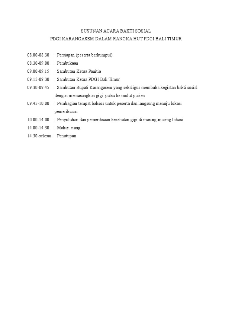 Rundown acara biasanya berbentuk tabel dan digunakan dalam berbagai event atau acara, baik itu acara seminar. Prosesi ini dimaknai sebagai perjanjian atau pernyataan sepakat dari calon suami dan calon istri, untuk mengikatkan diri. Kiranya susunan acara ini dapat menjadi contoh bagi kita semua. Berikut contoh dari rundown suatu acara bakti sosial di panti asuhan. Akad nikah merupakan acara inti dari seluruh rangkaian proses pernikahan.